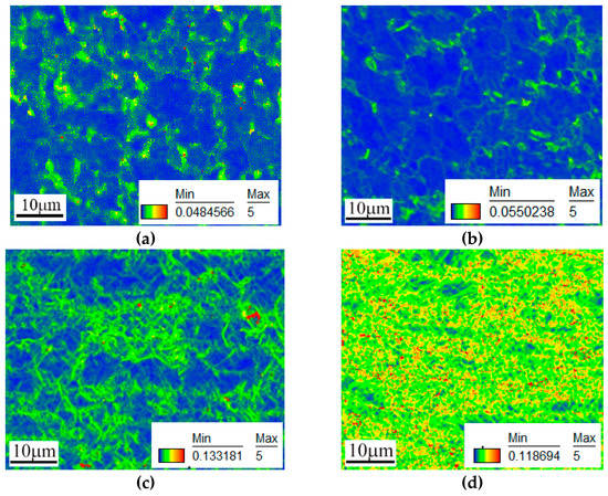 We used the kernel average misorientation (KAM) to show the local misorientation between neighbor grains, which can be expressed as the collective dislocation structure in the grains []. It is usually used to estimate the residual strain and plastic deformation. In this analysis, the colors of blue to red represent the KAM value of misorientation in the range of 0° and 5°, and misorientation values exceeding a threshold value of 5° were excluded from the KAM calculation. Figure 16 and Figure 17 show the KAM distributions under different conditions in the initial phase zone and the martensite phase zone. As shown by Figure 16, most regions in 22MnB5 steel exhibit low KAM values, as does the initial phase zone of the hot-stamped part with tailored properties, which means that residual stress does not increase due to selective heating and press hardening. However, with increasing deformation, the density of areas with high KAM values increases. When the deformation reaches 4% (Figure 16c), a green color around the grain boundaries can be clearly observed. There are wide regions of low KAM values, surrounded by regions of higher KAM values. KAM maps of samples deformed to 60% strain (Figure 16d) demonstrate a significant increase in local misorientation in the grain boundary region, appearing to consist largely of yellow regions, and even displaying red regions. In Figure 17, high misorientation is indicated in the martensite phase zone because the lattice distortion is large, whereas the lath interiors do not display any significant misorientation change before and after tensile deformation, which means that the tensile deformation does not cause micro-strain in the martensite zone. Therefore, the micro-strain in the re-deformation of the hot-stamped part with tailored properties has obvious regional characteristics according to the microstructure.