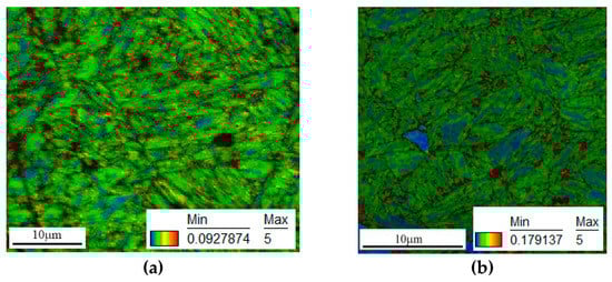 KAM maps of martensite phase zone undeform and fractured samples. (a) Martensite phase zone of hot-stamped parts with tailored properties; (b) martensite phase zone after fracture.
