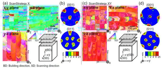 - Ishimoto, T.; Hagihara, K.; Hisamoto, K.; Sun, S.-H.; Nakano, T. Crystallographic texture control of beta-type Ti–15Mo–5Zr–3Al alloy by selective laser melting for the development of novel implants with a biocompatible low Young’s modulus. Scr. Mater. 2017, 132, 34–38. [Google Scholar] [CrossRef]