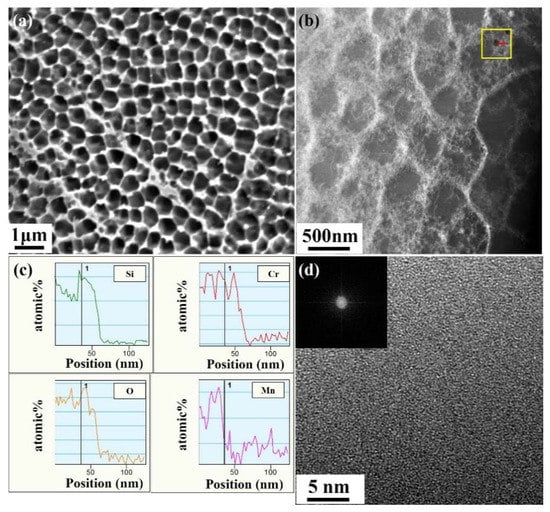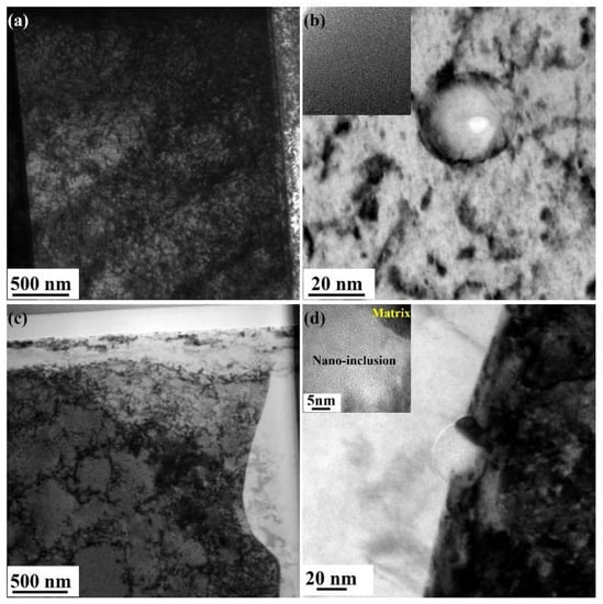 The TEM/energy dispersive X-ray spectroscopy (EDS) linear scanning was used to analyze the concentration of elements in the sub-grain boundaries (SGBs). It is worth noting that there is no discernible segregation of Cr or Mo for the region of SGBs, which is different from the results of Saeidi []. Qiu et al. [] did not observe the presence of such elemental segregation either and reported that the chemical heterogeneity due to the dislocations acts as sinks for solute diffusion, which is influenced by Σ3 boundaries, the elastic strain energy, the grain boundary energy, and several factors, such as the observed locations. In addition, some nano-inclusions are also found in the STEM image. The results of EDS line scanning show that the nano-inclusions contain Si, Cr, O, and Mn. We analyzed multiple nano-inclusions in the specimens; the elemental species observed remained consistent. Figure 2d shows a high-resolution TEM (HRTEM) image taken at the boundary region of a nano-inclusion, in the inset, a selected area electron diffraction (SAED) pattern taken from the middle of the nano-inclusion. These images confirm that the nano-inclusions are amorphous. The high temperature applied during the fabrication process and residual oxygen gas in the chamber may play a key role in the formation of nano-inclusions.