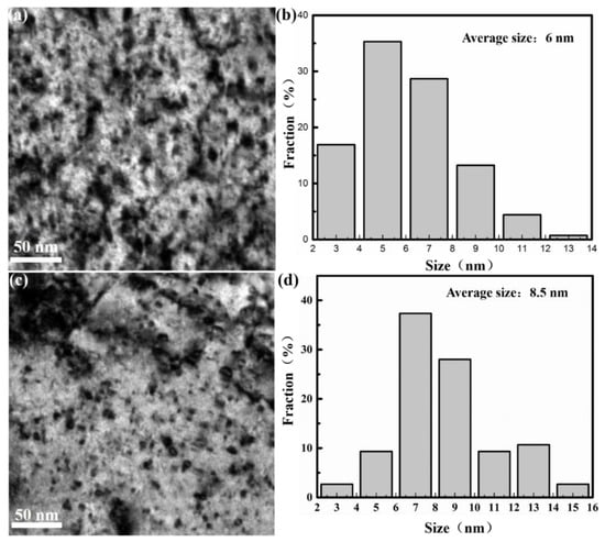 Distribution of dislocation loops in post-irradiated SLM 316L SS. (a) TEM image reveals the distribution of dislocation loops in specimens irradiated by Fe ions at RT with a dose of 1 dpa. (b) Size distribution of the dislocation loops. (c) TEM image reveals the distribution of dislocation loops in specimens irradiated by Fe ions at 450 °C with a dose of 1 dpa. (d) Size distribution of the dislocation loops.