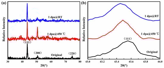 Figure 5 shows the GIXRD patterns of the SLM 316L SS samples obtained from different irradiation experiments. Comparison of the three patterns reveals that the post-irradiated specimens are primarily composed of the Face-Centered Cubic (FCC) lattice structure without a detectable second phase. After irradiation, the (111) peak showed a left shift and moved toward a lower angle. Figure 5b shows the enlarged (111) peak patterns and confirms that the 2θ increases with the decreasing irradiation temperature. According to the Bragg formula, the decrease of the diffraction angle means the increase of interplanar spacing which is proportional to the lattice constant. As the displacement damage of materials increase, the radiation-induced dislocation loops grow and the lattice distortion becomes larger. The results shown in Figure 5 indicate that the lattice swelling occurred after irradiation. However, the lattice swelling under high temperature irradiation is less than that under room temperature irradiation.