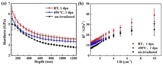 Since the thickness of irradiated region is less than 1 μm, regular mechanical tests like the tensile test are unsuitable in this case. To reflect the effects of radiation-induced defects on the mechanical properties, the nanoindentation test is widely used. Figure 6a shows the average hardness versus depth of the SLM 316L SS samples subjected to Fe ions irradiation at different temperatures. Here, data of depths greater than 100 nm were selected due to the uncertainties associated with the shape of Berkovich diamond indenter. The results clearly demonstrate that the hardness of post-irradiated samples decreased with increasing depth. We compared the hardness increments of samples irradiation at RT with those irradiated at 450 °C, and the model developed by Nix-Gao was used to confirm the hardness of the post-irradiated samples []. Figure 6b shows that the bi-linearity region with a shoulder is around 220–250 nm, which is approximately 1/5 of the irradiation damage depth, for the samples irradiated at RT and 450 °C; this result reflects the hardness in the region extending down five times of the indenter depth []. The average hardness of the irradiated samples was calculated as 4.0 GPa and 3.7 GPa. Compared with the hardness of the un-irradiated samples, which was calculated as 2.8 GPa, the hardness of the post-irradiated samples increased with decreasing irradiation temperature. The hardness enhancement was 42.8% and 32.1% to the original specimens, respectively.
