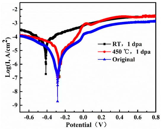 Figure 7 shows the polarization scans of pre- and post-irradiated SLM 316L SS samples collected in 0.9 wt.% NaCl, and Table 3 lists the corresponding parameters. In the original specimens, the current density (Jcor) was 0.80 μA/cm2, which is lower than that of traditional 316L SS samples tested in 9 g/L NaCl solution with a scan voltages ranging from −1 to 1 V []. Qi Chao et al. [] also observed the same result when comparing SLM and traditional 316L SS. These findings are related to the different grain sizes and chemical compositions of the two specimens, which are fabricated by different process. High solidification rates prevent the formation of MnS and Cr-depletion zones in the SLM fabrication process, which increase the corrosion resistance of this sample. Table 3 shows that the current densities of post-irradiated specimens are higher than those of the original samples. Thus, the corrosion rate of SLM 316L SS samples increased after Fe ions irradiation, which shows a degradation of corrosion resistance. Moreover, a significant divergence in the current density was observed between the two irradiation temperatures (56.7 μA/cm2 for the samples irradiated at RT versus 8.726 μA/cm2 for the samples irradiated at 450 °C). As described above, much more dislocations were observed in the interior of sub-grains in the case of RT than the case of 450 °C. These dislocations tangled and connected with the sub-grain boundaries. In the corrosive environment, this structure accelerates the diffusion of metal atoms, and thus increases the current density. Another recent study investigating the radiation effect of corrosion resistance of 316 SS in 3% NaCl also revealed a degradation of corrosion resistance during Fe ions irradiation []. Cr depletion caused by irradiation may also affect the corrosion resistance of this material. Details of the mechanism for the degradation of corrosion resistance must be determined in future work.