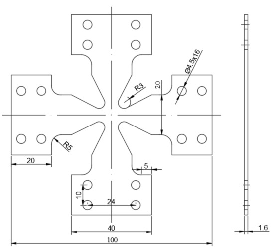 Referring to the specimens shown in references [15,22,23] and combining this information with the characteristics of the existing biaxial testing machine fixtures in the laboratory, the basic shape of the cruciform specimen in this paper is determined, the overall dimensions are 100 mm × 100 mm, the arm width is 20 mm, as shown in Figure 1. The overall thickness of the specimen is the same, and the central area is not thinned. The transition fillet is composed of a segment of arc and two straight lines.