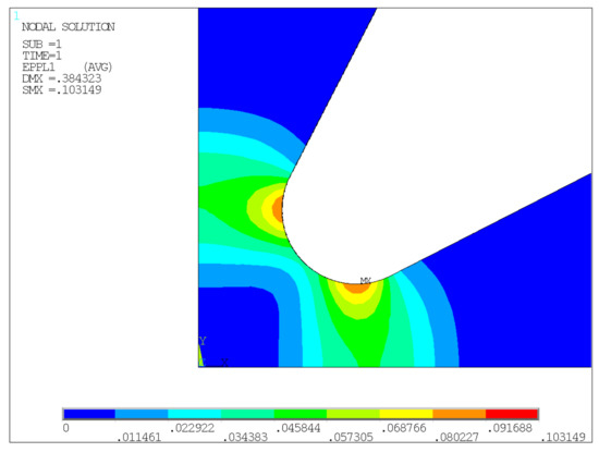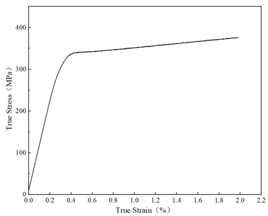 The cruciform specimen used in this test belongs to double symmetry plane geometry, and the 1/4 model is established by ANSYS 16.0 (ANSYS Inc., Pittsburgh, PA, USA). The solid structural unit of the model is eight-node finite element, and the overall unit size is set as 0.3 mm. Figure 2 is the finite element mesh and boundary conditions, the thickness direction is divided into six layers. The test material is commercial pure titanium TA2, according to the uniaxial tensile test, the elastic modulus is 121.92 GPa, Poisson’s ratio is 0.34, yield strength is 335.27 MPa. Figure 3 shows the true stress-strain response curve of the material. The model of elastic-plastic behavior used in finite element analysis (FEA) is Multilinear Isotropic Hardening Plasticity (MISO). The in-phase equibiaxial tensile stress of 100 MPa is applied to the horizontal and vertical end faces of the two arms respectively to obtain the maximum principal plastic strain nephogram, as shown in Figure 4.