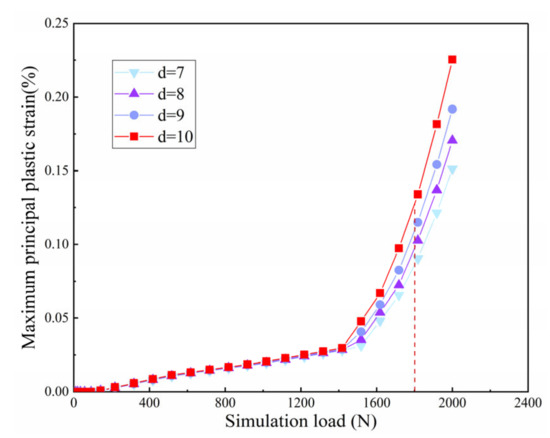 As is known from Section 2.3, if the overall thickness of the specimen is kept the same, the strain value in the central region is relatively small, and there is a large stress concentration at the filleting of the two arms. Therefore, the central area needs to be thinned appropriately. In the literature, hemispherical thinning design is often used in the cruciform specimen for biaxial fatigue test. The advantage of this scheme is that it can increase the deformation of the central area and reduce the stress concentration at the fillet between the two arms. The hemispherical thinning mainly involves two parameters, one is the diameter of the hemispherical edge of the thinning area d, the other is the minimum thickness t of the thinning area. Firstly, the thickness of the loading arm is set as 1.2 mm, and the minimum thickness of the central thinning zone is 0.3 mm. The hemispherical edge diameter is changed from 7 mm to 10 mm, increasing by 1 mm each time. The biaxial tensile tests were simulated under different loads. The biaxial loadings are equal and in the same phase. The loading process includes 25 load steps, and the maximum load is 2000 N. The maximum principal plastic strain of the central point was extracted, as shown in Figure 6.