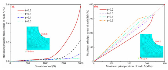 The simulation calculations of different thickness of the center were carried out respectively. Figure 7a shows the curve of the maximum principal plastic strain of the central node A with simulation load. It can be seen from the figure that the minimum thickness of the central zone has a great influence on the central strain level of the specimen. Under the same loading condition, the strain level increases with the decrease of the center thickness. When the central thickness is 0.4 mm and 0.5 mm, the maximum principal plastic strain in the central region is less than 0.10%. When the thickness is reduced to 0.3 mm and 0.2 mm, the strain level increases rapidly, reaching about 0.23% and 0.59% respectively.