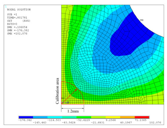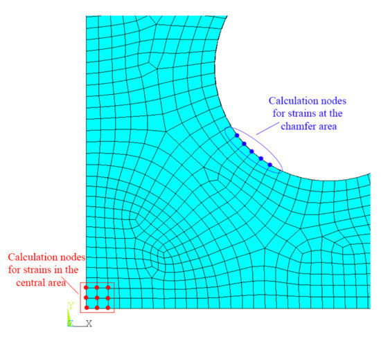 For the cruciform specimen, it is very important to ensure the large strain uniformity in the central gauge area and the greater stress concentration of the central region compared with the fillet. Therefore, it is necessary to define two objective coefficients as the measurement basis. A 1.2 mm × 1.2 mm square area in the center of the specimen is selected as the central strain extraction position. Here, the 1/4 model is established by finite element software, and the corresponding size is 0.6 mm × 0.6 mm. The arc length of about 1.2 mm is also selected to extract the strain at the fillet. The model is meshed using a 0.3 mm sized unit, as shown in Figure 8. There are nine nodes closest to the center and five nodes closest to the fillet. Then the central strain dispersion coefficient α is obtained: