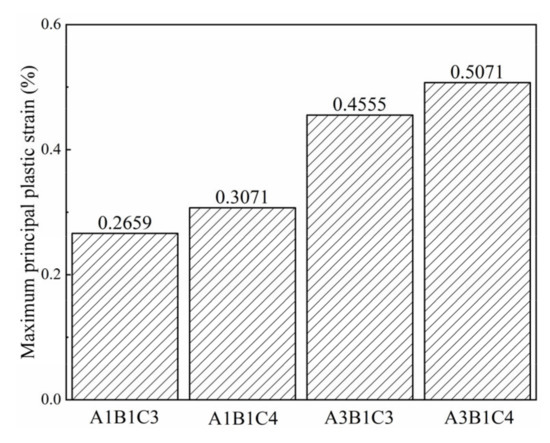 Maximum principal plastic strain in the central region of four combinations.