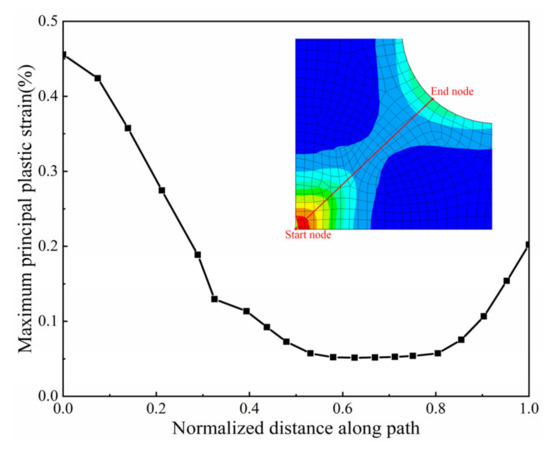 With the increase of loading, especially after 1400 N, the maximum principal plastic strain and equivalent plastic strain of the central node show a large upward trend. The larger the center diameter, the more obvious the curve rises, and the greater the strain value under the same load. It can be seen from Figure 6 that the maximum principal plastic strain will be greatly different with various diameters, which means that the diameter of the thinning zone has a great influence on the strain of the central region.