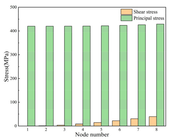 For cruciform specimens, the effect of shear stress should also be considered in order to obtain a more uniform strain field in the central region. The same in-phase load of 3 KN is applied to the two axes. The shear stress distribution of the optimized sample is shown in Figure 12. The shear stress is the largest at the corner of the loading arm, and gradually decreases with the distance from the center area. Figure 13 shows the stress distribution of the nodes along the direction of the red arrow in Figure 12. It can be seen from the figure that the farther away from the center, the greater the shear stress. The shear stress at the farthest node 8 is 39 MPa, which is only about 9% of the major stress here. In the circular area with radius of 1.2 mm in the center, the shear stress has little effect on strain and the strain distribution is more uniform. Therefore, the circular range with a center diameter of 2.4 mm can be used as an effective strain measurement area.