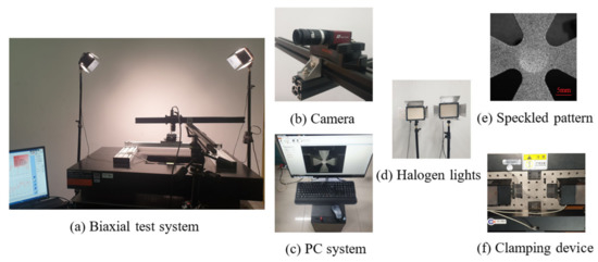 The biaxial test system and the non-contact strain measurement system based on DIC are shown in Figure 16. The DIC system uses a CCD camera (FUJIFILM HOLDINGS CORP., Akasaka, Tokyo, Japan) (Figure 16b), with a resolution of 2452 × 2056 pixels. The post-processing software adopts the calculation criterion of zero-normalized sum of squared differences (ZNSSD), and the subset size is set to 21 px. In displacement measurement, Gaussian prefiltering was used to reduce the bias error. Subsequently, the filtered image set was analyzed using the affine shape function and bilinear quadrilateral polynomial interpolation. Before the test, it is necessary to spray black and white paint on the surface of the sample to make the speckle pattern, as shown in Figure 16e.