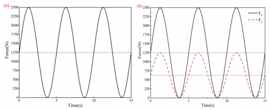 The specimen shown in Figure 15 is used for the biaxial fatigue test. For the equibiaxial test (Fx/Fy = 1), the loading waveforms of both axes are sine wave with an average value of 1250 N, an amplitude of 1250 N, and a frequency setting of 0.2 Hz, as shown in Figure 17a. For biaxial test (Fx/Fy = 2), the loading sine wave of X-axis with an average value of 1250 N, an amplitude of 1250 N; and the loading sine wave of Y-axis with an average value of 625 N, an amplitude of 625 N. The loading frequency is 0.2 Hz in both axes, as shown in Figure 17b. The two axis loads are applied synchronously under the control of the servo motor.