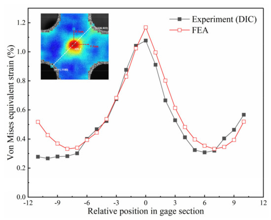The equibiaxial tensile test is carried out on the cruciform specimen by in-situ biaxial testing machine, and the whole field strain was measured by DIC. The post-processing software is used to extract the strain data points in the 45° diagonal direction of the central area of the specimen, and the results are compared with the finite element simulation results, as shown in Figure 18. It can be seen that the simulated value of von Mises strain on the diagonal reaches the peak at the center, and it is symmetrically distributed at the fillets on both sides. Although the experimental value measured by DIC is slightly lower than the simulation value, the overall change trend of the two is basically consistent. Due to the limitation of specimen processing technology, the thickness of the four arms cannot be guaranteed to be uniform and equal. According to ISO 16842: 2014 (E) [9], the accuracy of arm thickness meets the tolerance of ±0.1 mm. These errors make the strain of the fillet on both sides to show asymmetry. However, this effect cannot be taken into account because only the central strain of the specimen needs to be measured in the later fatigue test.
