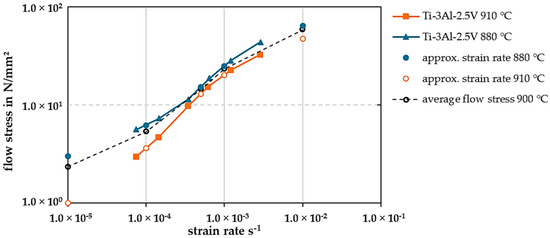Flow stress-strain rate diagram for Ti-3Al-2.5V according to [15,36] and derived values for the 900 °C forming temperature.