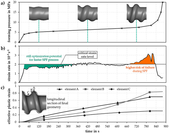 Figure 4 summarizes the results of the final simulation of the optimized time-dependent forming pressure curve, which ensured an adherence of the set maximum strain rate. Figure 4a shows the developed time-dependent forming pressure curve and several forming stages over time. Figure 4b illustrates the resulting maximum strain rate over time of the whole part together with the defined strain rate limit. Figure 4c summarizes the development of the effective plastic strain of three exemplary elements in critical forming areas. Within several simulation studies, the pressure curve was adjusted manually in several iterations until the maximum strain rate level over time approached the specified strain rate maximum of 2 × 10−3 s−1. Figure 4a shows the developed forming process in which an internal pressure of up to 20 MPa is set over 880 s. It becomes clear that at the beginning of the forming process, a fast pressure build-up is tolerable to overcome the yield point first. In fact, Figure 4b shows that it is evident that there is still optimization potential for the first 300 s of the process, since the maximum strain rate level is below the specified strain rate limit. Therefore, the process could run faster in this section by setting a steeper internal pressure-time curve. However, as an initial solution for feasibility studies, this internal pressure–time curve has been evaluated as sufficient.