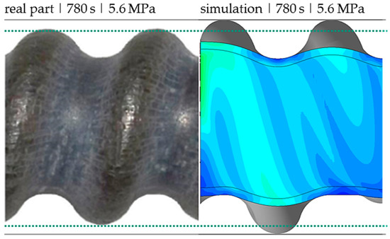 Figure 8 shows that the forming process is much faster than numerically predicted. It compares the real part, which was exemplarily removed from the process after 180 s, with the results of the process simulation after 180 s. The real part is significantly more shaped than it is within the simulation.