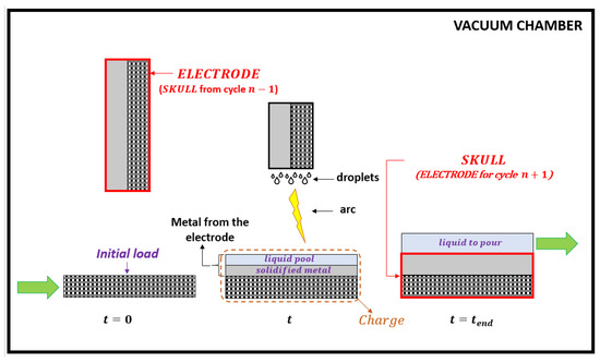 The furnace of the VASM process is decomposed in two parts: (i) a crucible where the melting of a consumable electrode occurs and (ii) an ingot mold in which the liquid metal is poured. The first step has the particularity to create the skull which will be used as the electrode of the next melting cycle. This is accomplished by means of a parallelepiped crucible made from water-cooled copper panels bolted together [6]. At the beginning of each cycle, scrap of any type and size (called the initial load on Figure 1) is deposited in this crucible. Above the crucible, a consumable electrode is vertically hung from a ram which can be moved up and down. As stated above, this electrode is the skull from the previous cycle. The melting sequence begins when an electric arc is ignited between the lower tip of the electrode and the initial load in the crucible, causing melting of both. Liquid metal (originating mainly from the electrode) accumulates inside the crucible where it fills in a pool at the top before partly solidifying upon contact with the water-cooled panels. The metal within the crucible, constituted of the initial load, the solidified metal and the liquid pool is called the charge in this paper. When the mass of the liquid pool reaches an expected value, typically equal to the mass of the initial load, the electric arc is switched off. The crucible is then tilted and the liquid pool is poured into the ingot mold. After cooling under vacuum or an inert gas atmosphere, the furnace is unloaded: a new ingot is stripped from the mold, and a thick crust of solid metal, hereinafter called the skull, is stripped from the crucible.