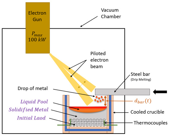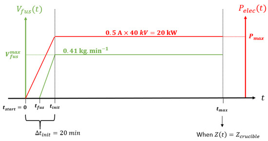 The intensity of the EB was linearly increased up to during the first 20 min and then was kept constant until the end of the melt, which means an electrical power equal to 20 kW as the voltage is kept constant kV. The melting rate was measured through the pushing speed of the bar feeder (13 mm/min once the steady state was reached) as . No experimental information is available concerning the moment when the actual melting started, so we estimated it at half of the transitory phase () and assumed a linear variation of the melt rate from this moment until the steady state. All the operating conditions of the melting test are reported in Figure 4.