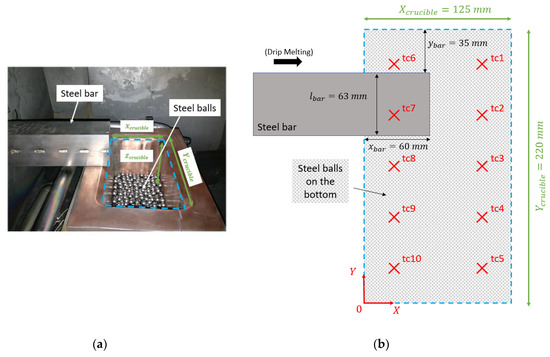 A drip melting experiment was performed to simulate the VASM process. Hence, steel balls () were initially loaded inside the crucible as a packed bed, leading to a porosity close to . The height of the ball layer is mm. The steel ball layer mimics the scraps and raw materials in the VASM process and will be referenced as the initial load in this paper. A steel bar (square section with ) was positioned above and perpendicular to the crucible (see Figure 3a). During the melting, the steel bar was fed into the EB furnace at a constant speed by a bar pusher in order to keep the bar tip location constant, as shown in Figure 3b. Ten type K thermocouples ( to ) were inserted within the steel ball layer at different heights (see Figure 3b). The locations of the thermocouples are also reported in the Table 1. During the melting process, the EB continuously melts the tip of the bar and steel droplets fall into the crucible where they may either immediately solidify or fill in a pool depending of the beam power. The steel alloy used for both the balls and the bar is a stainless steel whose properties will be reported in Section 3.3.