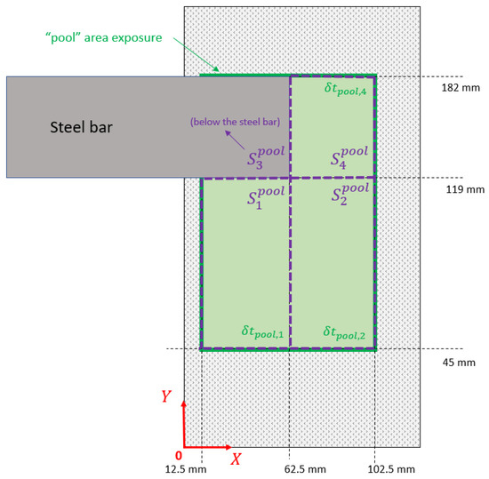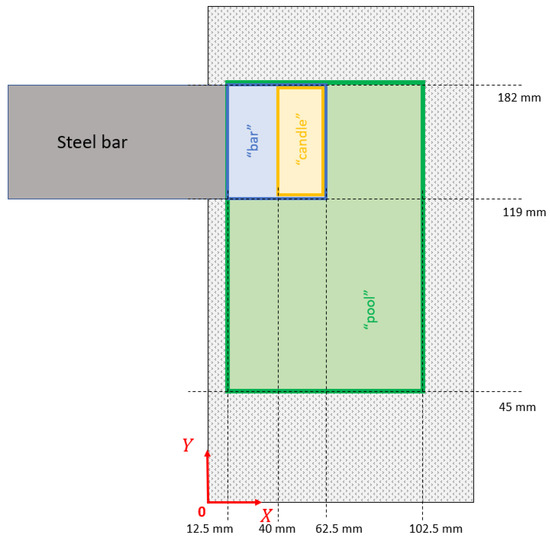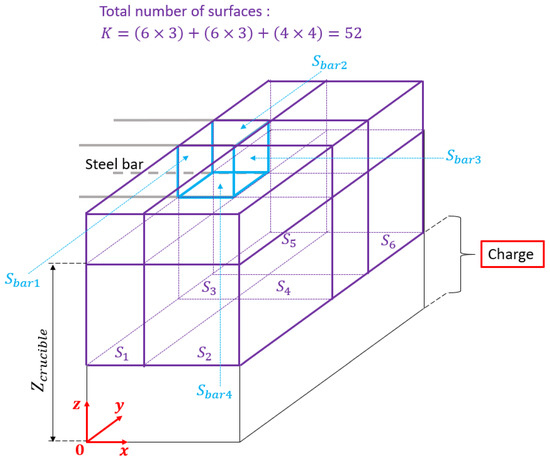 The space between the top of the charge and the tip of the steel bar is divided into 12 volumes having a rectangular parallelepiped shape (in purple in Figure 8), leading to a system of 52 surfaces. All solid surfaces are supposed to behave as grey bodies (i.e., their emissivity is independent on the temperature).