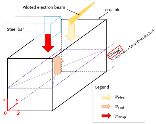 As it will be discussed, the numerical resolution of Equation (3) is performed using a finite volume technique, hence a structured mesh composed of hexahedral cells. The melting of the steel bar leads to a rise in the height of the charge with the processing time. This growth of the metal volume is accounted for by an adaptive mesh in the Oz direction. According to the melting rate , the height of the top layer of the mesh is increased at each time step and a new layer of cells is created when the top layer size becomes higher than a reference cell size. The steel droplets feeding the crucible are supposed to be at a temperature equal to: