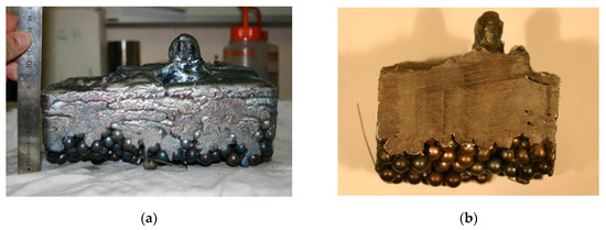 The skull was easily removed from the copper crucible after cooling. Figure 9 reveals that the steel ball layer was not remelted and that the infiltration of liquid metal through the porous bed was hardly noticeable. Moreover, the top surface of the skull was far from flat and horizontal, and the presence of a candle of solid metal reveals that the liquid steel heated at the tip of the bar was partly solidified before being in contact with the top of the charge.