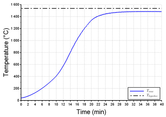 The calculated height of the charge at the end of the remelting test (z = 8.25 cm) is in good agreement with the average value measured (see Figure 9a). This clearly indicates that, as assumed in the simulation, the liquid steel did not infiltrate the raw charge. Figure 10 confirms that the maximum temperature calculated by the numerical model remains lower than the liquidus temperature, i.e., the EB power applied at the top of the charge did not allow for the formation of an actual liquid pool.