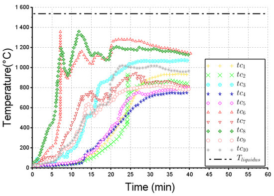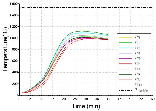 As stated previously, ten thermocouples have been installed within the steel ball layer (their location is shown in Figure 3). The actual and simulated thermograms are reported in Figure 11 and Figure 12 respectively, for the 40 min of the melting trial. Again, all temperatures are much lower than the steel liquidus temperature, which implies that no liquid pool was formed during this melting operation. At the beginning of the experiment, the thermocouples and reached higher temperatures than the other ones. It could be explained by some rare infiltrations of metal within the initial bed of steel balls. Obviously because the infiltrations are not modelled, their thermal effect cannot be obviously observed in the numerical results. The other thermocouples display a similar dynamic behavior. We can observe a significant time-lag (around 10 min) required for the heat to diffuse from the top surface to the location of the thermocouples, followed by a temperature increase at a rate lying between 35 and 50 °C/min. Finally, the maximum temperature (800–1050 °C) was reached at t = 25 min. The calculated curves (Figure 12) match relatively well with these dynamics, showing a characteristic S-shape for a diffusive transfer. This is particularly true for the group of thermocouples (tc3, tc7, tc9 and tc10) where the dynamic behaviour (heating rate around 50 °C/min) and the maximum temperature (around 1000 °C) are well simulated. The agreement appears however weaker for another group of thermocouples (tc1, tc2, tc4 and tc5) since the time-lag and maximum temperatures do not match properly. This could be explained by the mediocre filling of the crucible with the incoming partly liquid steel.