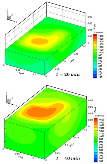 The numerical simulation calculates the 3D temperature field at any time of the melting process as shown in Figure 13. An increase in the surface temperature with time is noticed, and the maximum surface temperature is located just below the edge of the steel bar (i.e., approximately above the thermocouple tc8).
