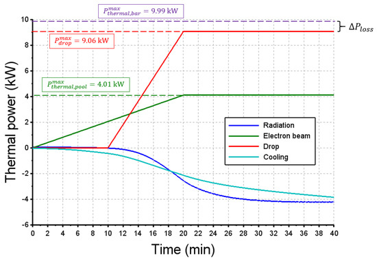 Associated with this thermal field, Figure 14 reports the global heat balance of the steel charge into the crucible, as assessed by the numerical simulation. The dotted green line and dotted purple line draw the thermal heat provided by the electron beam on the metal surface when the stationary melting rate is attained () and on the bar () respectively. Obviously, their sum is equal to the total beam thermal power:
