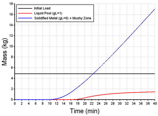 Predicted mass of the initial load (in black), of the liquid pool (in red) and of the solidified metal including the mushy zone (in blue) vs time. “power+” case.