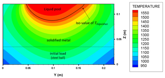 The numerical results of this “power+” case simulation show that the initial load composed of steel balls is still not remelted since the top surface temperature of this ball bed remains below the liquidus temperature. The first drops of liquid steel (t = 10 min) solidify when contacting the steel balls but soon after the model predicts a liquid pool to be formed, as presented in Figure 15. The mass of the liquid bath increases slowly and continuously until reaching 1.5 kg, when the EB is switched off.
