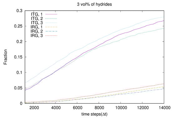 Plot of fractions of intra-granular and inter-granular hydrides with respect to time in the presence of 3 vol% hydrides. The fractions of hydrides with 1, 2 and 3 structural variants cases are plotted. ITG and IRG stand for Inter-granular, Intra-granular, respectively and the numbers next to comma indicate the number of structural variants.