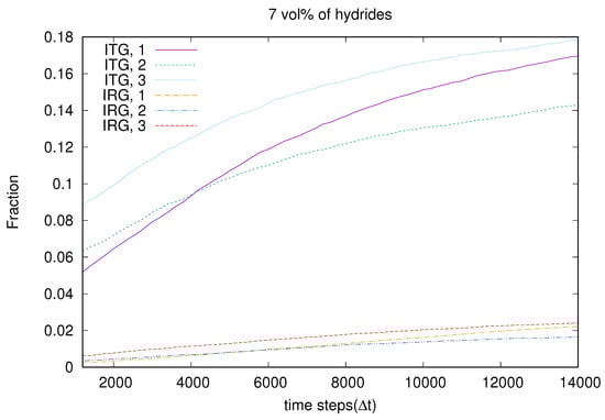 Plot of fractions of intra-granular and inter-granular hydrides with respect to time in the presence of 7 vol% hydrides. The fractions of hydrides with 1, 2 and 3 structural variants cases are plotted. ITG and IRG stand for Inter-granular, Intra-granular, respectively and the numbers next to comma indicate the number of structural variants.