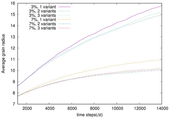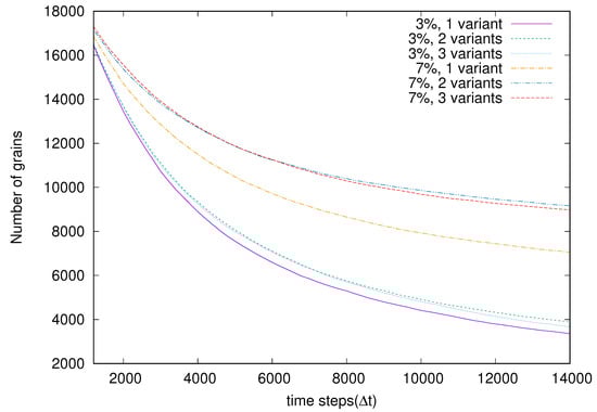 The phenomenological parameters in Equations (2)–(4) were set to and in our simulations. We set in Equation (5) and which we need it to calculate the Laplacian in Equation (4). All phenomenological values are non-dimensionalized values and we can convert it to the quantity with unit, once we have detailed information of grain boundary energy, width and grain growth rate of Zr system. The phenomenological parameters were selected according to the selection of previous studies that quantitatively reproduced ideal grain growth [,]. A periodic boundary condition was applied to all directions. was set to in our simulations. Initially, spherical particles were distributed to randomly chosen locations, and overlap between initial seed grains was not allowed. OpenMP parallelization was applied to efficiently utilize multi-core CPU capability []. The simulation cell size was , and initially, spherical grains were distributed. Initially, 20,000 grains were distributed, and we performed simulations for 14,000 time steps.