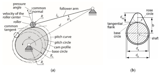 The cam-follower mechanisms have wide applications in different kinds of machines such as alternative combustion engines, sewing machines, machine tools, etc., due to their advantages. For instance, they are simple and compact mechanisms, they are cheap, they have few mobile parts, and the follower displacement law is easy to design. The cam mechanisms have three parts: a cam, a follower, and a fixed frame [1]. The most common cam-follower mechanism that is employed in combustion engines consists of a disk cam and a follower with translating or oscillating movement (Figure 1a). The cams for combustion engines are usually symmetric, while the ones that are used in high speed applications or aeronautics are asymmetric [2]. The cams for combustion engines can be classified into three categories: convex flank cams, tangential flank cams, and concave flank cams. In the present work, a tangential flank cam has been used (Figure 1b).
