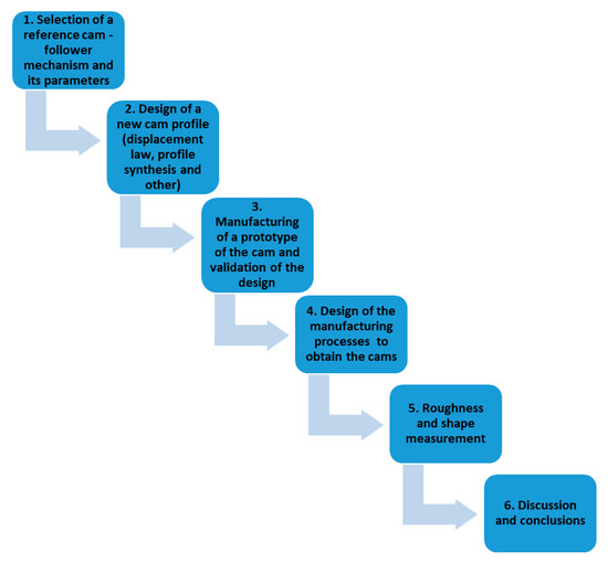 The exposed methodology consists of six steps, which will be explained in the following subsections. First, a reference cam-follower mechanism was selected. Then, using reverse engineering, a new cam profile was designed. Next, a three-dimensional (3D) printed prototype was obtained to validate the design. Then, the manufacturing process of the cams, obtained by either milling or WEDM, was defined. The cams were manufactured, and both roughness and shape error of their external contour were measured. Finally, conclusions were drawn from the results.