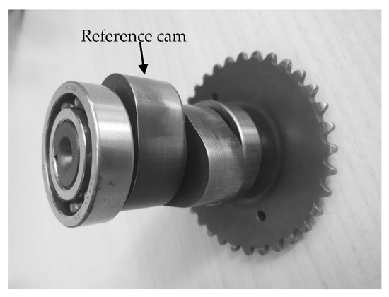 As a start point, a reference cam-follower mechanism was selected, a real cam from the camshaft of a single-cylinder internal combustion engine of a motorcycle (Figure 3), available at the Department of Mechanical Engineering (DEM) of the School of Engineering of Barcelona (ETSEIB). Because of the absence of geometric data of the reference cam and follower mechanism, as well as about their displacement law, reverse engineering was used to determine the required start information for the design process of the cam. Different parameters of the real cam-follower mechanism were measured (see Figure 4 and Table 1), with a Mitutoyo digital micrometer.