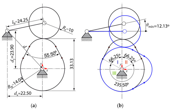 (a) Measured parameter values in the reference cam-follower mechanism (length units are mm); (b) segments of the profile and maximum follower angular displacement.