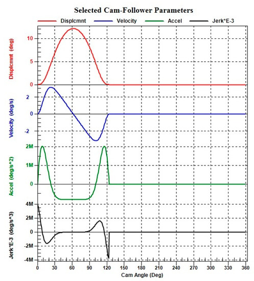 The two performance quality indices of the mechanism, pressure angle, and cam profile curvature radius, have been checked with Dynacam (Table 2).