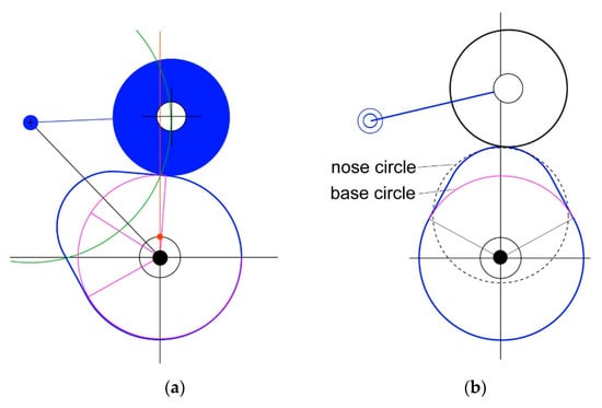 (a) Cam-follower mechanism that has been obtained with Dynacam; (b) limit configurations with the indications of the base and nose circles in the cam profile.
