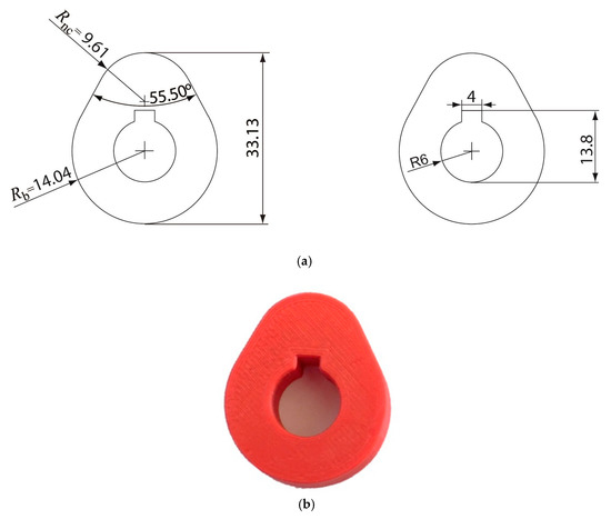 Based on the profile obtained, a virtual prototype of the cam has been created using SolidWorks 2016 (Dassault Systèmes SE, Vélizy-Villacoublay, France). Subsequently, a prototype of the cam has been printed in polylactic acid (PLA) with the fused filament fabrication (FFF) or fused deposition modeling (FDM) technology (Figure 7b).