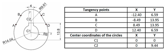 Example of the determination of the tangency points in the milled cam profile (units are mm).