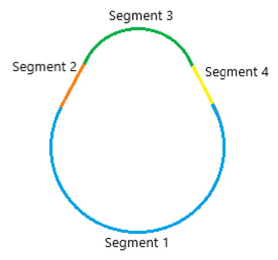 In the measurement process, the cam profile was divided into four segments (Figure 9). Segment 1 corresponds to the base circle (in blue); segment 3 corresponds to the nose circle (in green); and, segments 2 (in orange) and 4 (in yellow), correspond to the straight flanks.