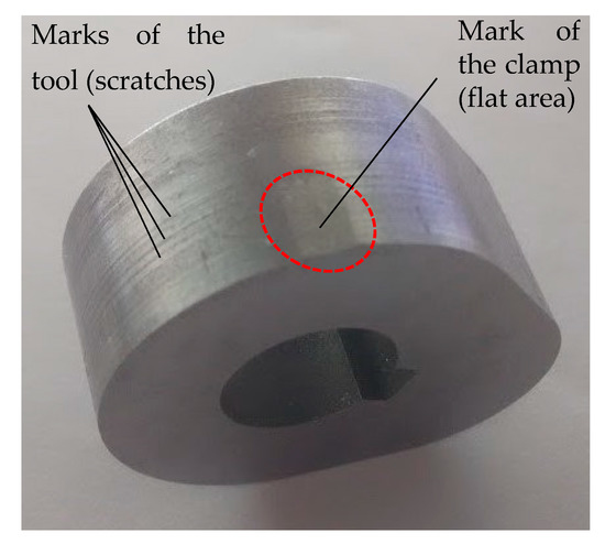 In the milled cam, two main flaws have been detected. The first one corresponds to the mark left by the adaptable clamp that was used to fix the part in the machining center. The mark does not comprise the whole thickness of the piece, but only a local area (Figure 10). In the future, it is recommended to place a small aluminum plate between the clamp and the workpiece, in order to minimize the effect of the clamp. On the other hand, the contoured surface presented slight scratches that can be attributed to an incorrect setting of the tool or tool wear [40], although it was apparently in good condition.