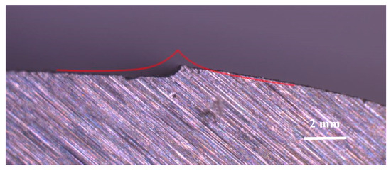 In the WEDM cam, a geometric imperfection has been observed due to the entry and exit of the wire (Figure 11). This kind of shape error is inherent to this type of process if the piece does not contain any outer corner at 90°. For this reason, it has been decided to begin and end the passes tangentially to the surface of the piece, at one of the points of change of shape, in order to reduce as much as possible its influence on the quality of the cam. Figure 11 shows a detail of the workpiece, where the expected shape is shown in red. The real surface is slightly different because the force applied by the fixing magnet was not sufficient to keep the piece completely straight, and its weight has made it tilt slightly. During the cutting process, a clamping nerve is maintained in the area (Figure 12).