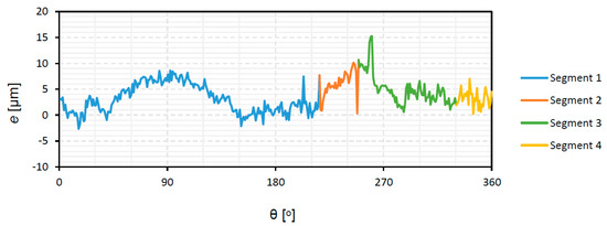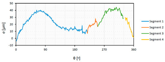 Along the profile, errors are mainly positive, with some small areas where they are negative. This means that the milled piece is slightly larger than the theoretical model. The highest positive difference within segment 1 is obtained at 90°, which corresponds to the end of the cam in the area of the base circle. At the end of segment 2, there is a sharp decrease in the value of the shape error up to 0 μm, followed by an increase up to 15 μm at the beginning of segment 3. Those extreme values correspond to the entry and exit of the milling tool during the machining process of the contour. The total error range is 18 μm. It is lower than the shape error that was reported by Norton, around ±25 μm for parts that were manufactured with standard milling tools [4], and similar to the value reported by Rothbart for high-speed machines, in the ±8 μm range [40]. For camshafts of combustion engines with ground lobes, lower tolerances are obtained of ±2.5 μm [14].