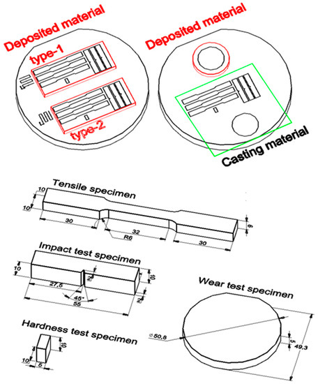 All mechanical properties experiments were performed at room temperature (26 °C), and they were performed to relatively compare the mechanical properties of NAB materials fabricated by cast NAB and WAAM. The specimen coupons for each test were collected from the deposition layer as shown in Figure 2. There are three types of test specimens. These were classified into type 1 and type 2 according to the deposition path, and the substrate was classified as the casting material.